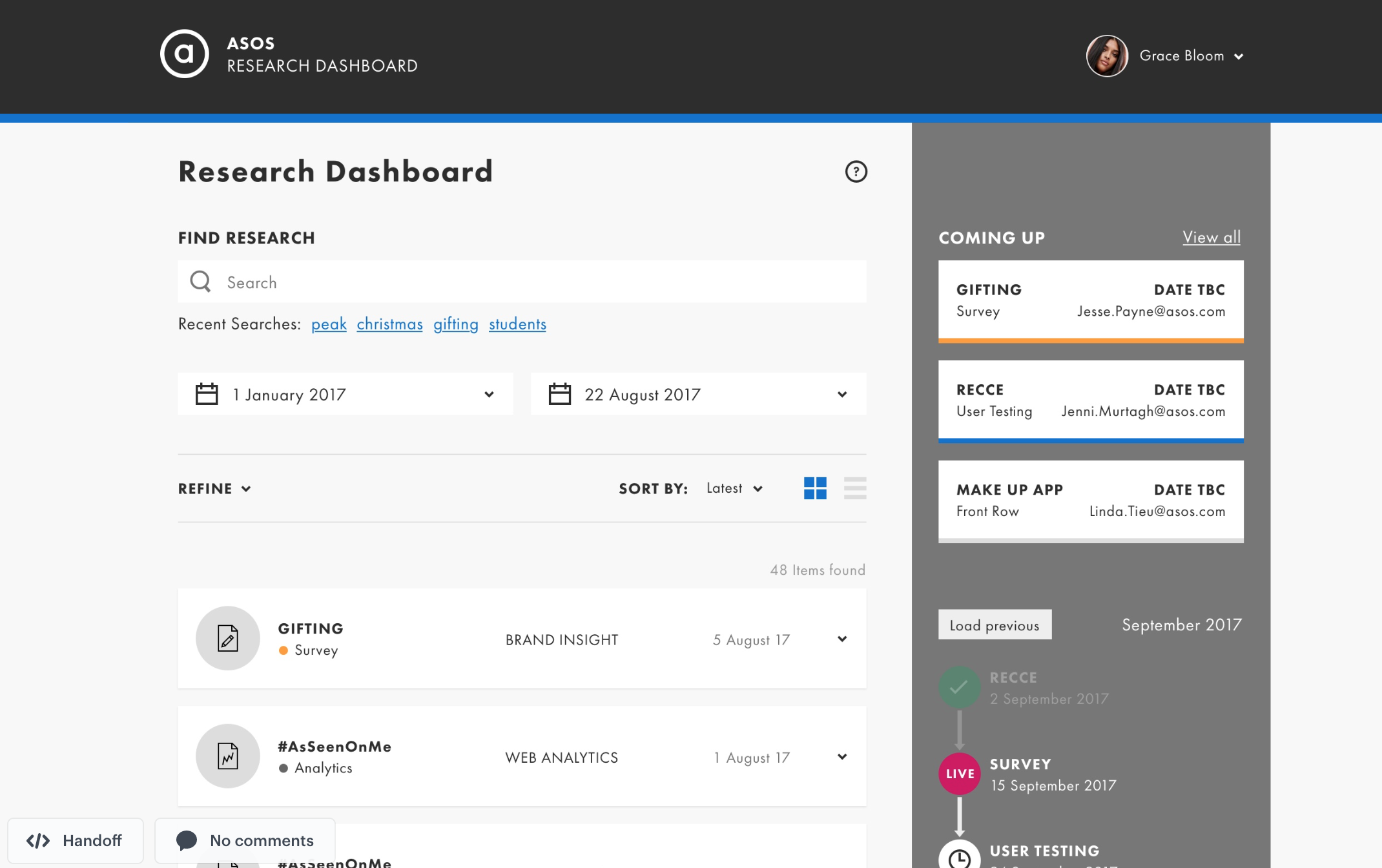 So I set about designing a dashboard for searching all our research, with tags, dates, names attached. I included a section of what was coming up next too so anyone could add a question or make sure they logged in to watch the live stream.